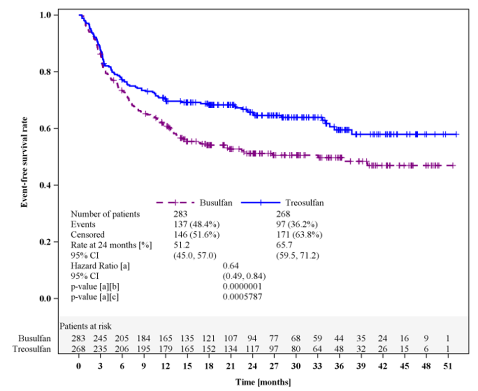 Det primära effektmåttet för denna studie var händelsefri överlevnad efter 2 år. Händelser definierades som sjukdomsrecidiv, transplantatsvikt eller dödsfall (det som inträffade först). Non-inferiority för FT10 jämfört med referensen FB2 blev statistiskt bevisad. P‑värdet 0,0005787 tyder på överlägsenhet (superiority) för treosulfan jämfört med busulfan (figur 1).