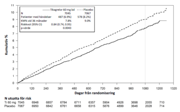 I relation till enbart ASA, reducerade tikagrelor 60 mg två gånger dagligen signifikant det primära sammansatta effektmåttet för kardiovaskulär död, hjärtinfarkt och stroke. Var och en av komponenterna bidrog till reduktionen av det primära sammansatta effektmåttet (kardiovaskulär 17 % RRR, hjärtinfarkt 16 % RRR och stroke 25 % RRR).