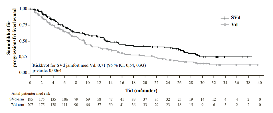 Mediantiden till respons var 1,4 månader hos patienterna som fick SVd och 1,6 månader hos patienterna som fick Vd. Medianvaraktigheten på responsen (DoR), bland de svarande patienterna, var 20,3 månader i SVd-armen respektive 12,9 månader i Vd-armen.