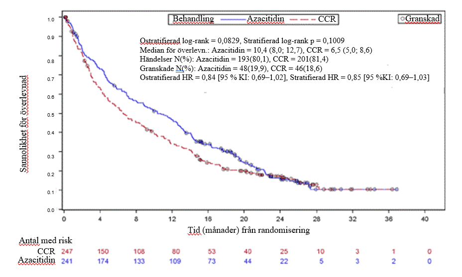 Vid ITT‑analysen av 488 patienter (241 azacitidin och 247 CCR) associerades azacitidinbehandlingen med en medianöverlevnad på 10,4 månader mot 6,5 månader för patienter som fick CCR‑behandling, en skillnad på 3,8 månader, med ett stratifierat log‑rank p‑värde på 0,1009 (tvåsidigt). Hazardkvoten för behandlingseffekten var 0,85 (95 % KI = 0,69; 1,03). De ettåriga överlevnadsfrekvenserna var 46,5 % för patienter som fick azacitidin mot 34,3 % för patienter som fick CCR.