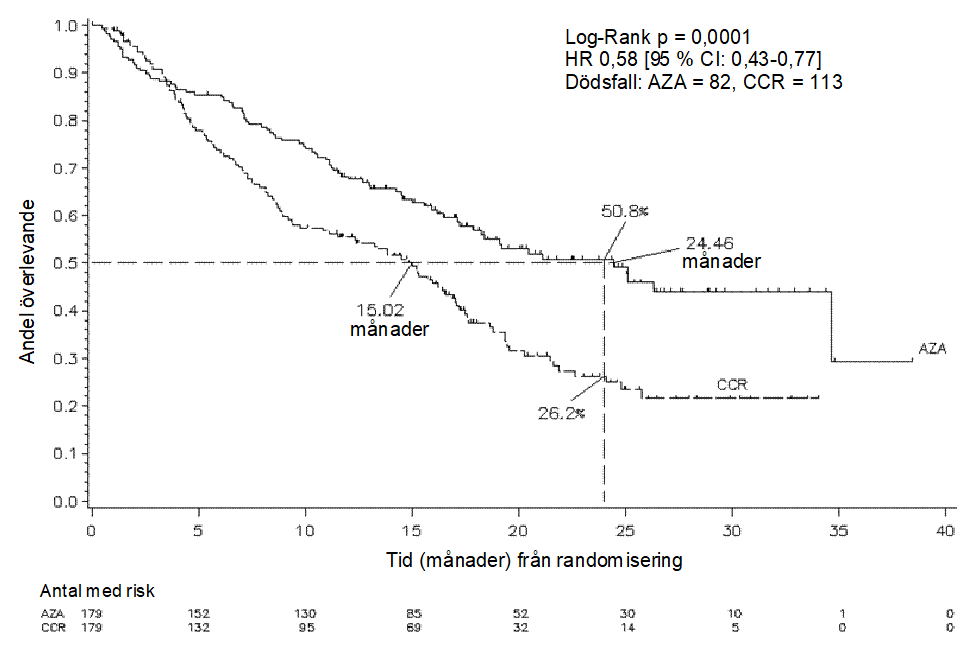 Trots att studien inte var utformad för att visa en statistiskt signifikant skillnad när man jämförde azacitidin med de förvalda CCR‑behandlingsgrupperna, var dessutom överlevnaden för azacitidinbehandlade patienter längre jämfört med CCR‑behandlingsalternativen enbart BSC, låg dos av cytarabin plus BSC, och likartade jämfört med intensiv kemoterapi av standardtyp plus BSC.