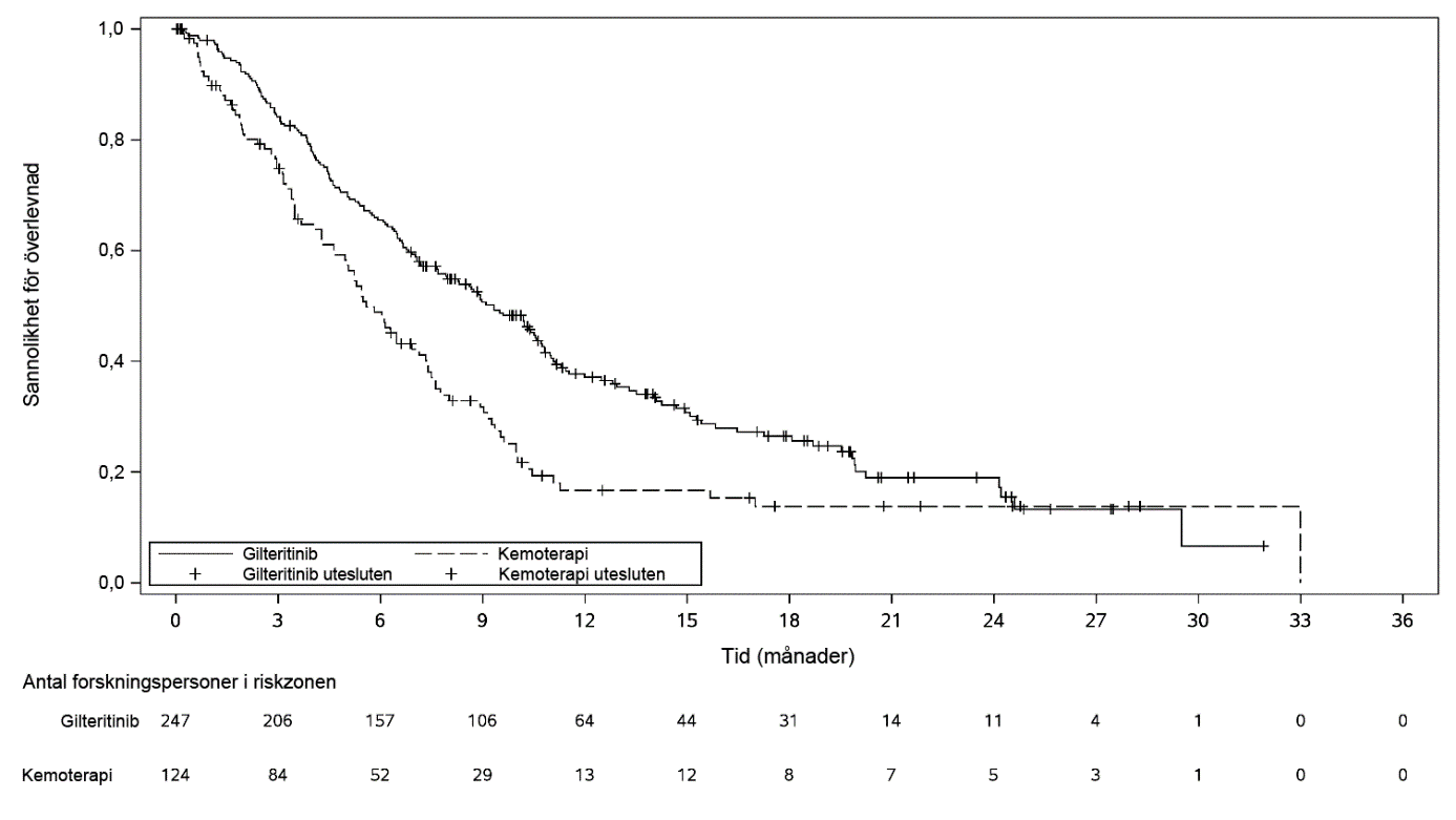 Primär effekt-endpoint för den slutliga analysen var total överlevnad (overall survival, OS) i intent-to-treat-populationen (ITT-populationen), uppmätt från randomiseringsdatumet fram till döden oavsett orsak (antal händelser som analyserades var 261). Patienter som randomiserats till gilteritinib-armen hade signifikant längre överlevnad jämfört med kemoterapiarmen (Riskkvot 0,637, 95 % KI 0,490–0,830, ensidigt p‑värde: 0,0004). Median-OS var 9,3 månader för patienter som fick gilteritinib och 5,6 månader för de som fick kemoterapi. Effekten påvisades även av frekvensen av komplett remission (CR)/komplett remission med partiell hematologisk återhämtning (CRh) (tabell 3, figur 1).