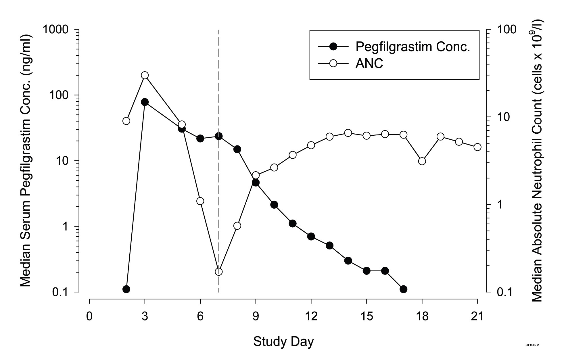 Efter en subkutan engångsdos av pegfilgrastim uppnås maximal serumkoncentration av pegfilgrastim 16‑120 timmar efter dosering, och serumkoncentrationen av pegfilgrastim bibehålls under neutropeniperioden efter myelosuppressiv kemoterapi. Elimineringen av pegfilgrastim är icke-linjär i förhållande till dosen och pegfilgrastims serumclearance minskar med ökande dos. Pegfilgrastim verkar elimineras huvudsakligen genom neutrofilmedierad clearance, som blir mättad vid högre doser. I överensstämmelse med en självreglerande clearancemekanism, minskar pegfilgrastimkoncentrationen i serum snabbt när neutrofilantalet börjar stiga igen (se figur 1).