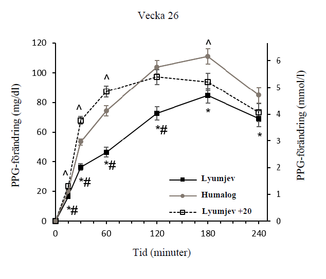 ^p < 0,05 för parvis jämförelse av Lyumjev +20 och Humalog