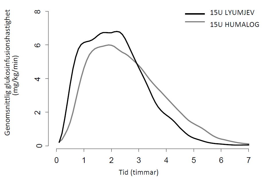fann man efter injektion av Lyumjev sju gånger mer insulin lispro i cirkulationen under de första 15 minuterna än efter injektion av Humalog, och tre gånger mer insulin lispro under de första 30 minuterna än med Humalog.