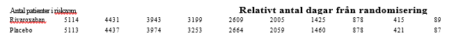 COMMANDER HF-studien inkluderade 5022 patienter med hjärtsvikt och uttalad kranskärlssjukdom efter inläggning på sjukhus för dekompenserad hjärtsvikt. Patienterna blev slumpmässigt indelade i en av de två behandlingsgrupperna: rivaroxaban 2,5 mg två gånger dagligen (N=2507) respektive matchande placebo (N=2515). Medianen för behandlingstiden i studien var 504 dagar.