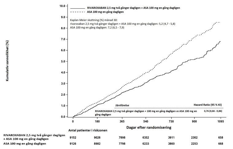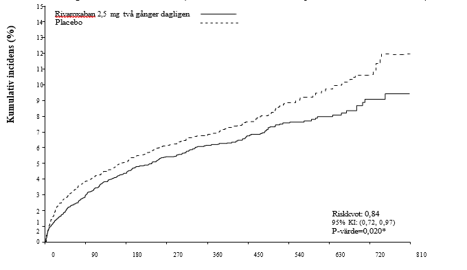 Den primära effektanalysen (d.v.s. dödsorsak oavsett orsak, hjärtinfarkt, eller stroke) visade ingen signifikant statistisk skillnad mellan gruppen som fick rivaroxaban 2,5 mg två gånger dagligen och placebo med riskkvot=0,94 (95 % KI 0,84 – 1,05), p=0.270. För dödsorsakoavsett orsak var det ingen skillnad mellan rivaroxaban och placebo i antal händelser (frekvensen av händelser per 100 patient-år; 11,41 jämfört med 11,63, riskkvot: 0,98; 95 % KI: 0,87 till 1,10; p=0.743). Frekvensen av händelser av hjärtinfarkter per 100 patient-år (rivaroxaban jämfört med placebo) var 2,08 jämfört med 2,52 (riskkvot 0,83; 95 % KI: 0,63 till 1,08; p=0.165) och för stroke var frekvensen av händelser per 100 patient-år 1,08 jämfört med 1,62 (riskkvot: 0,66; 95 % KI: 0,47 till 0,95; p=0,023). Det primära säkerhetsmåttet (d.v.s. blödning med dödlig utgång eller blödning i ett kritiskt organ med risk för permanent funktionsnedsättning), inträffade hos 18 (0,7 %) patienter i gruppen med rivaroxaban 2,5 mg två gånger dagligen respektive 23 (0,9 %) av patienterna i placebogruppen (riskkvot=0,80; 95 % KI 0,43 – 1,49; p=0.484). Det var en statistisk signifikant ökning av allvarliga blödningar enligt ISTH-kriterier i rivaroxabangruppen jämfört med placebo (frekvensen av händelser per 100 patient-år: 2,04 jämfört med 1,21, riskkvot 1,68; 95 % KI: 1,18 to 2,39; p=0.003).
