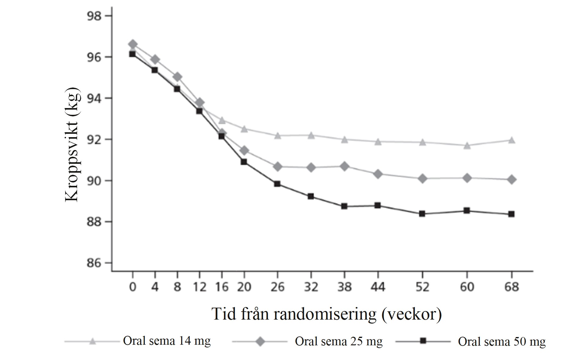 Patienter som behandlas med subkutan semaglutid 0,5 mg en gång i veckan kan gå över till peroral semaglutid 7 mg eller 14 mg en gång dagligen.