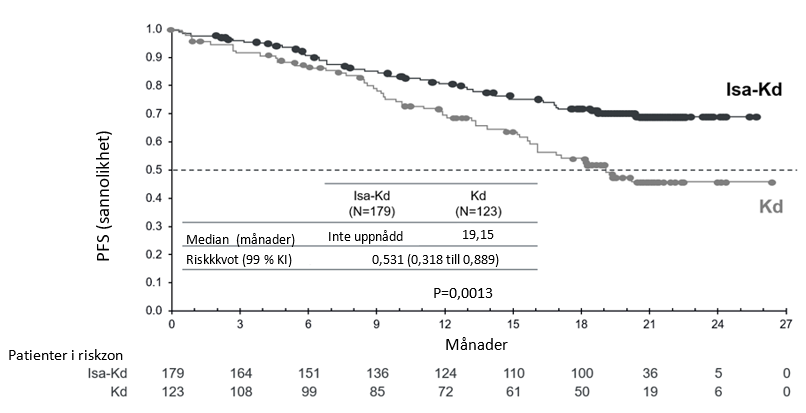 Med en medianuppföljningstid på 49,31 månader visade analysen av PFS från den första randomiseringen en statistiskt signifikant förbättring med en 35,7 % minskning av risken för sjukdomsprogression eller död hos patienter som behandlades med Isa‑VRd jämfört med patienter som behandlades med VRd under induktionen följt av autolog stamcellstransplantation och underhållsbehandling med lenalidomid (HR = 0,643; 95 % KI: 0,456 till 0,907).
