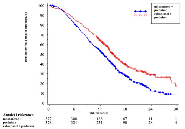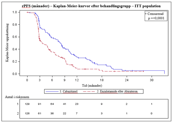 Studien nådde sin primära slutpunkt: rPFS var signifikant längre med kabazitaxel jämfört med AR- riktat läkemedel (8,0 månader respektive 3,7 månader), med en 46 % reduktion av risken för radiografisk progression jämfört med AR-riktat läkemedel (se tabell 6 och figur 2).
