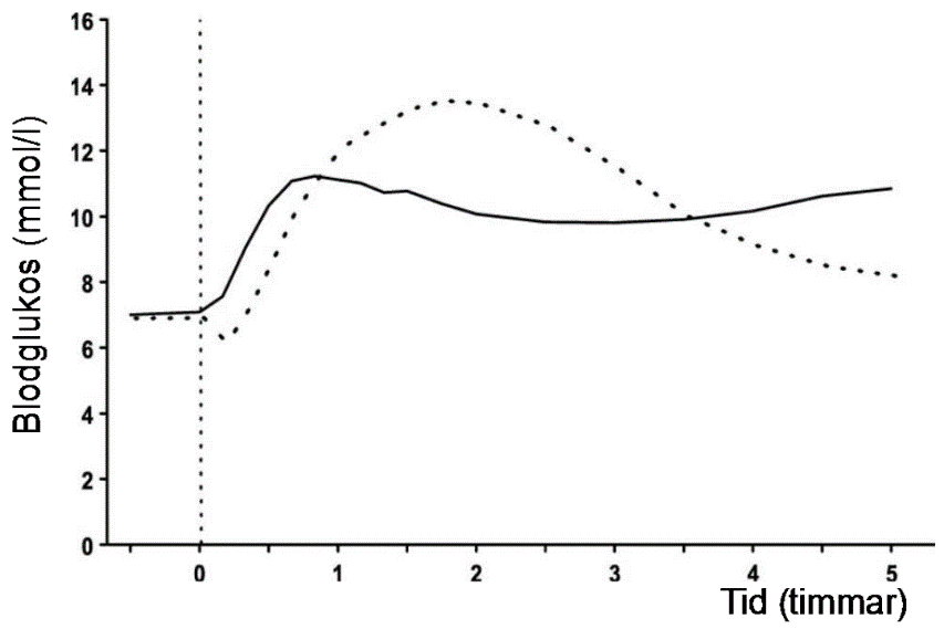 Fig. I. Blodglukoskoncentrationer efter en singeldos insulin aspart injicerad omedelbart före en måltid (den heldragna kurvan) eller lösligt humant insulin administrerat 30 minuter före en måltid (den prickade kurvan) hos patienter med typ 1-diabetes mellitus.
