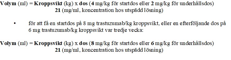för att få en startdos på 4 mg trastuzumab/kg kroppsvikt, eller en efterföljande veckovis dos på 2 mg trastuzumab/kg kroppsvikt: