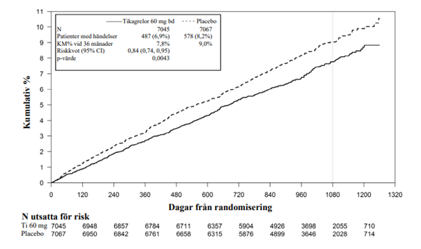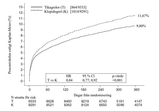 Resultatet visade sig tidigt (absolut riskreduktion [ARR] 0,6 % och relativ riskreduktion [RRR] 12 % efter 30 dagar), med en konstant behandlingseffekt under hela tolvmånadersperioden som gav en ARR på 1,9 % per år med en RRR på 16 %. Detta tyder på att det är lämpligt att behandla patienterna med tikagrelor 90 mg två gånger dagligen i 12 månader (se avsnitt 4.2). Behandling av 54 patienter med akut kranskärlssjukdom med tikagrelor i stället för klopidogrel förhindrar 1 aterotrombotisk händelse; behandling av 91 förhindrar 1 kardiovaskulär död (se figur 1 och tabell 4).