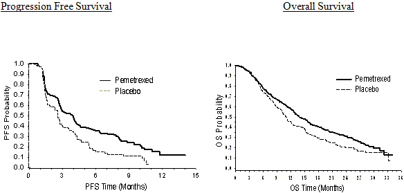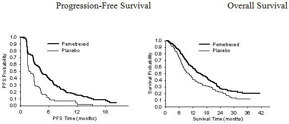 Studien uppfyllde primärt effektmått och visade en statistiskt signifikant förbättring i progressionsfri överlevnadstid (PFS) i pemetrexedarmen jämfört med placeboarmen (N = 581, oberoende granskning av populationen, medianvärde 4,0 respektive 2,0 månader) (hazardkvot = 0,60, 95 % KI: 0,49–0,73, p < 0,00001). Den oberoende undersökningen av patientbilderna bekräftade resultatet av prövarens bedömning av PFS. Medianvärdet för total överlevnadstid i hela populationen (N = 663) var 13,4 månader med pemetrexed och 10,6 månader med placebo, hazardkvot = 0,79 (95 % KI: 0,65–0,95, p = 0,01192).