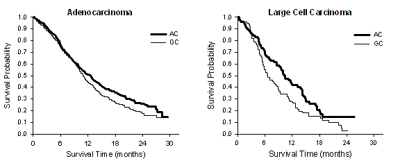 Analysen av den inverkan histologin av icke-småcellig lungcancer har på total överlevnad visade kliniskt relevanta skillnader beträffande överlevnad beroende på histologi, se tabellen nedan.