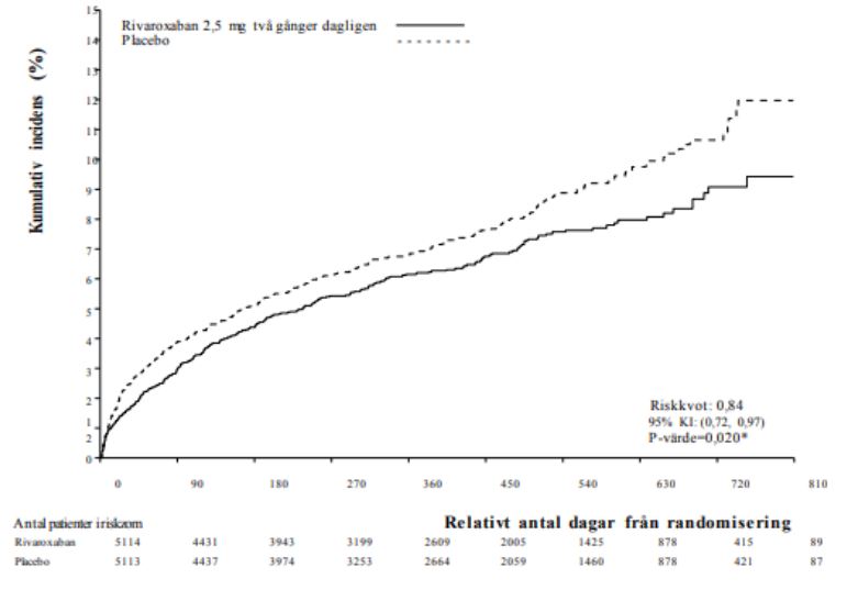 Rivaroxaban 2,5 mg två gånger dagligen kombinerat med acetylsalicylsyra 100 mg en gång dagligen var överlägset acetylsalicylsyra 100 mg avseende minskning av det primära sammansatta effektmåttet kardiovaskulär död, hjärtinfarkt och stroke (se tabell 7 och figur 2).