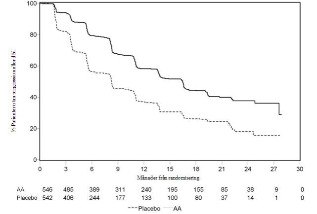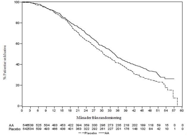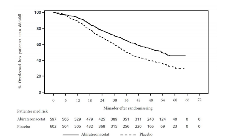 Den planerade slutliga analysen för OS utfördes efter att 741 dödsfall observerats (median uppföljningstid 49 månader). Sextiofem procent (354 av 546) av patienterna behandlade med abirateronacetat, jämfört med 71 % (387 av 542) av patienterna behandlade med placebo, hade avlidit. En statistiskt signifikant OS-fördel som talade för den abirateronacetat-behandlade gruppen påvisades med 19,4 % minskning av risken för dödsfall (riskkvot = 0,806; 95 % CI: [0,697; 0,931], p = 0,0033) och en förbättring av median OS på 4,4 månader (abirateronacetat 34,7 månader, placebo 30,3 månader) (se tabell 6 och figur 5). Den här förbättringen påvisades trots att 44 % av patienterna i placebogruppen fick abirateronacetat som efterföljande behandling.
