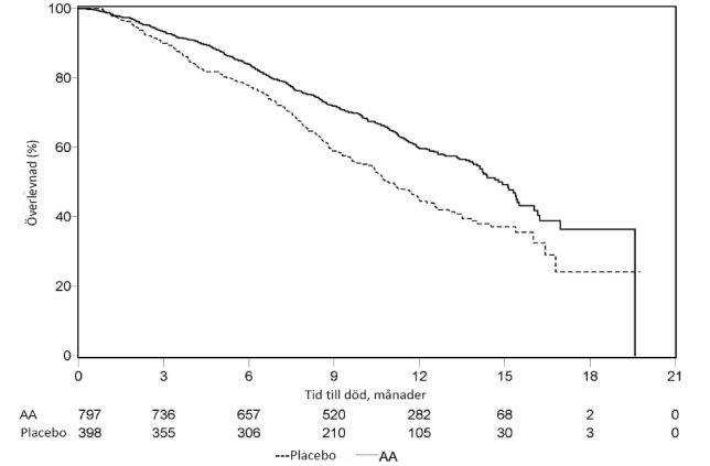 En statistiskt signifikant förbättring av OS till fördel för AA-P plus ADT observerades med en 34 % minskning av risken för dödsfall jämfört med placebo plus ADT (riskkvot = 0,66; 95 % CI: 0,56, 0,78; p < 0,0001), (se tabell 3 och figur 2).