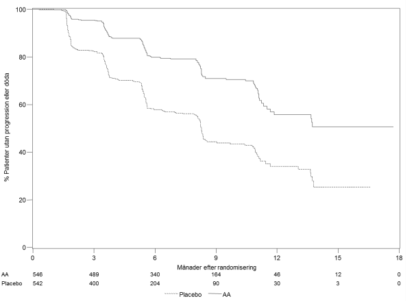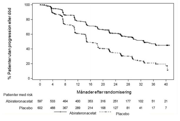 Vid den planerade rPFS analysen fanns det 401 händelser, 150 (28 %) av patienterna som behandlades med abirateronacetat och 251 (46 %) av patienterna som behandlades med placebo hade radiografiska tecken på progression eller hade avlidit. En signifikant skillnad i rPFS mellan behandlingsgrupperna observerades (se tabell 4 och figur 3).