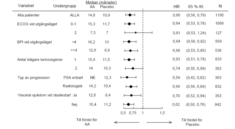 AA= abirateronacetat, BPI=Brief Pain Inventory, C.I.=konfidensintervall, ECOG=Eastern Cooperative Oncology Group Performance Score, HR=riskkvot, NE=kan ej bedömas