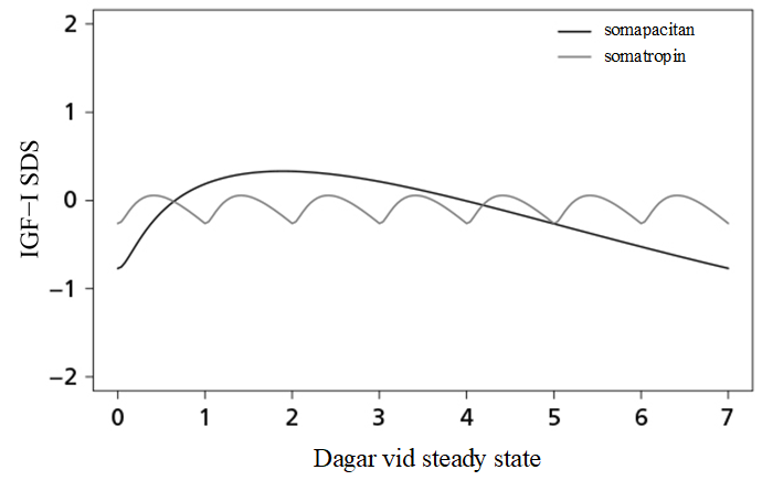 I huvudfasen av den kliniska studien uppnåddes IGF-I SDS-värden på 0 och högre hos 53% av somapacitanbehandlade vuxna studiepatienter med GH-brist efter en 8-veckors dostitreringsperiod. Denna andel var dock lägre i speciella undergrupper, såsom kvinnor på oralt östrogen (32%) och patienter med barndomsdebut (39%) (tabell 9). Post-hoc-simuleringsanalyser visade att andelen vuxna patienter med GH-brist som uppnådde IGF-I-SDS-nivåer över 0 förväntas vara högre om dostitrering med somapacitan efter 8 veckor skulle tillåtas. I denna simuleringsanalys antogs att dostitrering med somapacitan tolererades väl hos alla patienter tills IGF-I SDS-målintervallet eller en somapacitandos på 8 mg per vecka skulle uppnås.