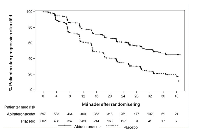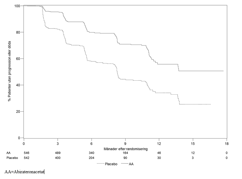 Vid den planerade rPFS‑analysen fanns det 401 händelser, 150 (28 %) av patienterna som behandlades med abirateronacetat och 251 (46 %) av patienterna som behandlades med placebo hade radiografiska tecken på progression eller hade avlidit. En signifikant skillnad i rPFS mellan behandlingsgrupperna observerades (se tabell 4 och figur 3).