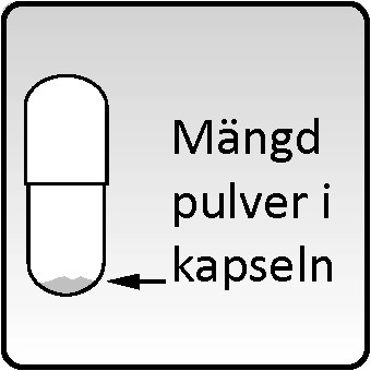 Kapselinnehåll: Laktosmonohydrat (vilket kan innehålla små mängder av mjölkproteiner) Kapselskal: Hypromellos (E464) Tryckfärg på kapseln: Shellack (E904) Svart järnoxid (E172) Propylenglykol (E1520) Ammoniak (E527) Kaliumhydroxid (E464)