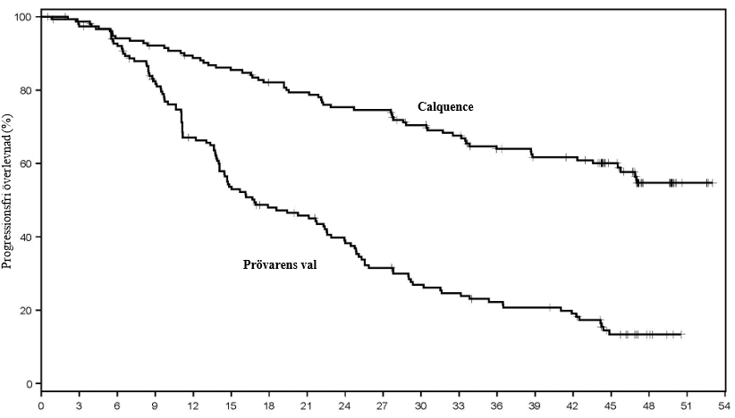 Vid slutlig analys, med en median uppföljningstid på 46,5 månader för Calquence och 45,3 månader för IR/BR, observerades en minskning med 72 % i risk för prövarutvärderad sjukdomsprogression eller död hos patienter i Calquence-armen. Den prövarutvärderade PFS medianen uppnåddes inte för Calquence och var 16,8 månader för IR/BR. Effektresultat enligt INV (Investigator assessments) presenteras i tabell 15. Kaplan-Meier-kurvan för INV-utvärderad PFS visas i figur 4.