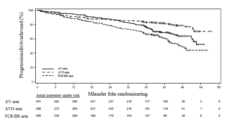 Vid slutlig analys, med en median uppföljningstid på 46,5 månader för Calquence och 45,3 månader för IR/BR, observerades en minskning med 72 % i risk för prövarutvärderad sjukdomsprogression eller död hos patienter i Calquence-armen. Den prövarutvärderade PFS medianen uppnåddes inte för Calquence och var 16,8 månader för IR/BR. Effektresultat enligt INV (Investigator assessments) presenteras i tabell 15. Kaplan-Meier-kurvan för INV-utvärderad PFS visas i figur 4.