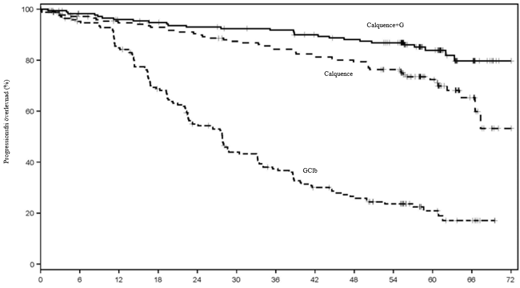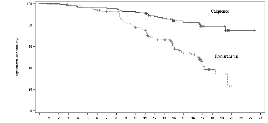 Primärt effektmått var PFS, utvärderat enligt IRC IWCLL 2008-kriterier med förtydligande om behandlingsrelaterad lymfocytos (Cheson 2012) inkorporerat. Med en median uppföljningstid på 16,1 månader visade PFS en statistiskt signifikant minskning i risk för död eller progression hos patienter i Calquence-armen. Effektresultat presenteras i tabell 13. Kaplan-Meierkurvan för PFS visas i figur 3.