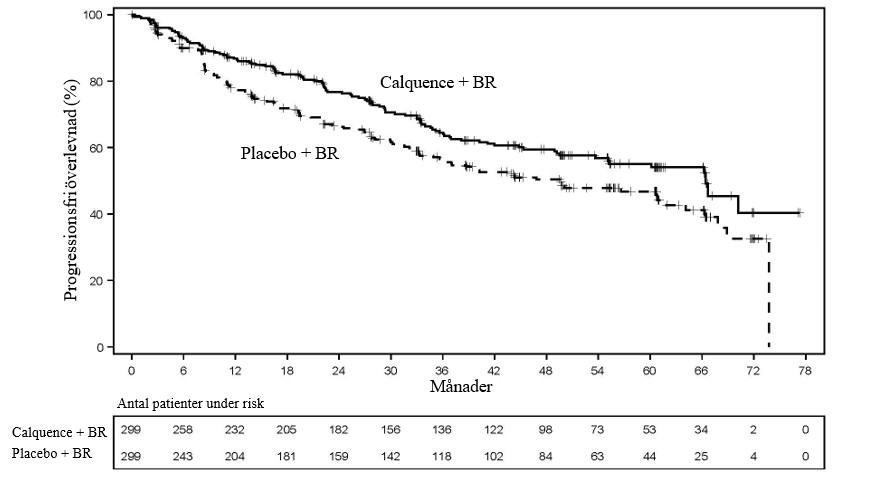 Med ytterligare 6 månaders uppföljning från den primära PFS-analysen och en medianuppföljning på 63,0 månader uppnåddes inte median total överlevnad i någon arm. Det totala antalet dödsfall var 218: 105 (35,1 %) i Calquence + BR-armen och 113 (37,8 %) i placebo + BR-armen. Effektresultaten presenteras i tabell 16. Kaplan-Meier-kurvorna över PFS visas i figur 5.