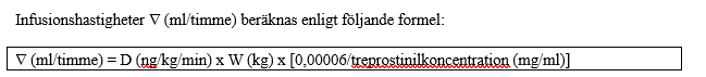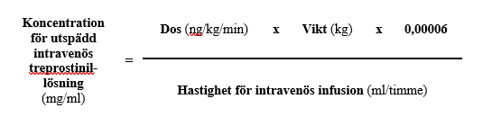 Typvolymerna för läkemedelsreservoarer som används för intravenösa infusionssystem är 20, 50 eller 100 ml. Sedan lämplig hastighet för den intravenösa infusionen (ml/timme), patientens dos (ng/kg/min) och patientens vikt (kg) har bestämts, kan koncentrationen (mg/ml) för den utspädda intravenösa treprostinillösningen beräknas med följande formel: