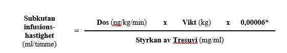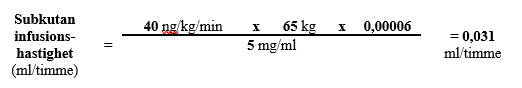 För en 65 kg person med en dos på 40 ng/kg/min med 5 mg/ml Tresuvi beräknas infusionshastigheten på följande sätt: