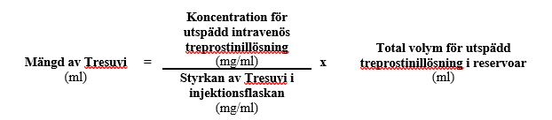 Mängden Tresuvi som behövs för att tillreda önskad koncentration av utspädd intravenös treprostinil-lösning för en given reservoarstorlek kan beräknas med följande formel: