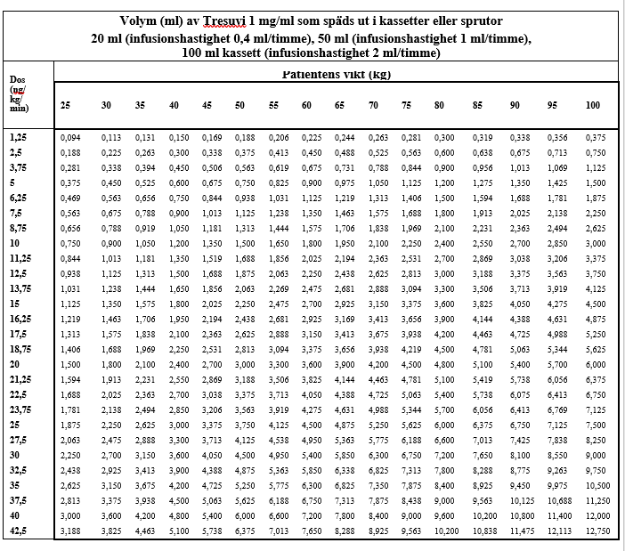 Tabell 2 anger riktlinjer för hur mycket Tresuvi 1 mg/ml som ska utspädas för att uppnå den volym (ml) som behövs för reservoarer på 20 ml, 50 ml eller 100 ml (motsvarande infusionshastigheter 0,4; 1 och 2 ml/timme) för patienter med olika kroppsvikt, när doser på upp till 42,5 ng/kg/min ska administreras.