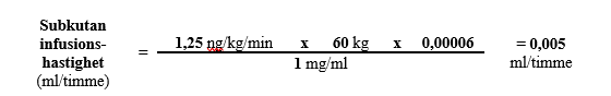 För en 60 kg person med rekommenderad initialdos på 1,25 ng/kg/min med 1 mg/ml Tresuvi kan infusionshastigheten beräknas på följande sätt: