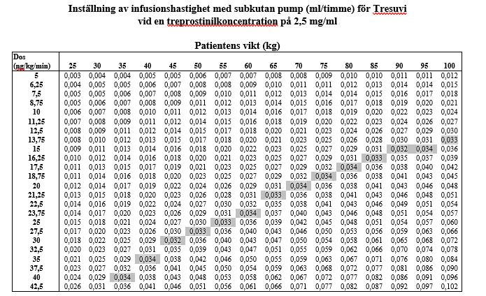 Tabell 1 anger riktlinjer beträffande subkutan infusionshastighet för Tresuvi 2,5 mg/ml för patienter med olika kroppsvikt motsvarande doser med upp till 42,5 ng/kg/min.
