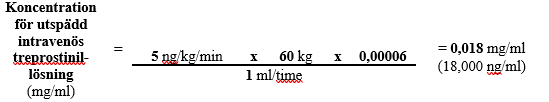 För en person som väger 60 kg och som har ordinerats en dos på 5 ng/kg/min med en på förhand bestämd infusionshastighet på 1 ml/timme och en reservoar på 50 ml beräknas den utspädda treprostinillösningens koncentration på följande sätt: