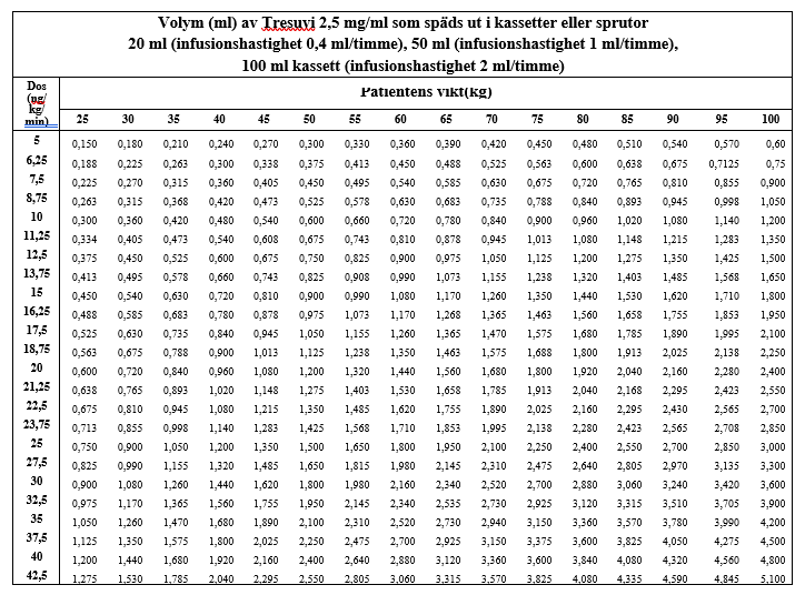 Tabell 2 anger riktlinjer för hur mycket Tresuvi 2,5 mg/ml som ska utspädas för att uppnå den volym (ml) som behövs för reservoarer på 20 ml, 50 ml eller 100 ml (motsvarande infusionshastigheter 0,4; 1 och 2 ml/timme) för patienter med olika kroppsvikt, när doser på upp till 42,5 ng/kg/min ska administreras.