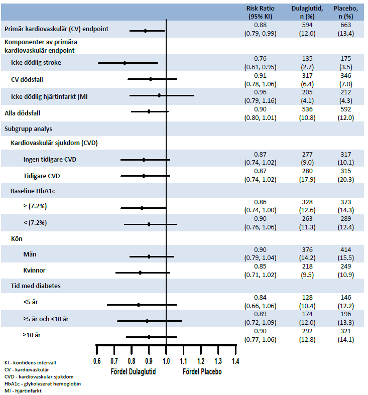 Den långsiktiga Trulicity studien av kardiovaskulära utfall var en placebokontrollerad, dubbelblind klinisk studie. Patienter med typ 2-diabetes tilldelades slumpmässigt antingen Trulicity 1,5 mg (4 949) eller placebo (4 952), båda som tillägg till standardbehandling för vård av typ 2-diabetes (0,75 mg-dosen administrerades inte i denna studie). Median uppföljningstid var 5,4 år.