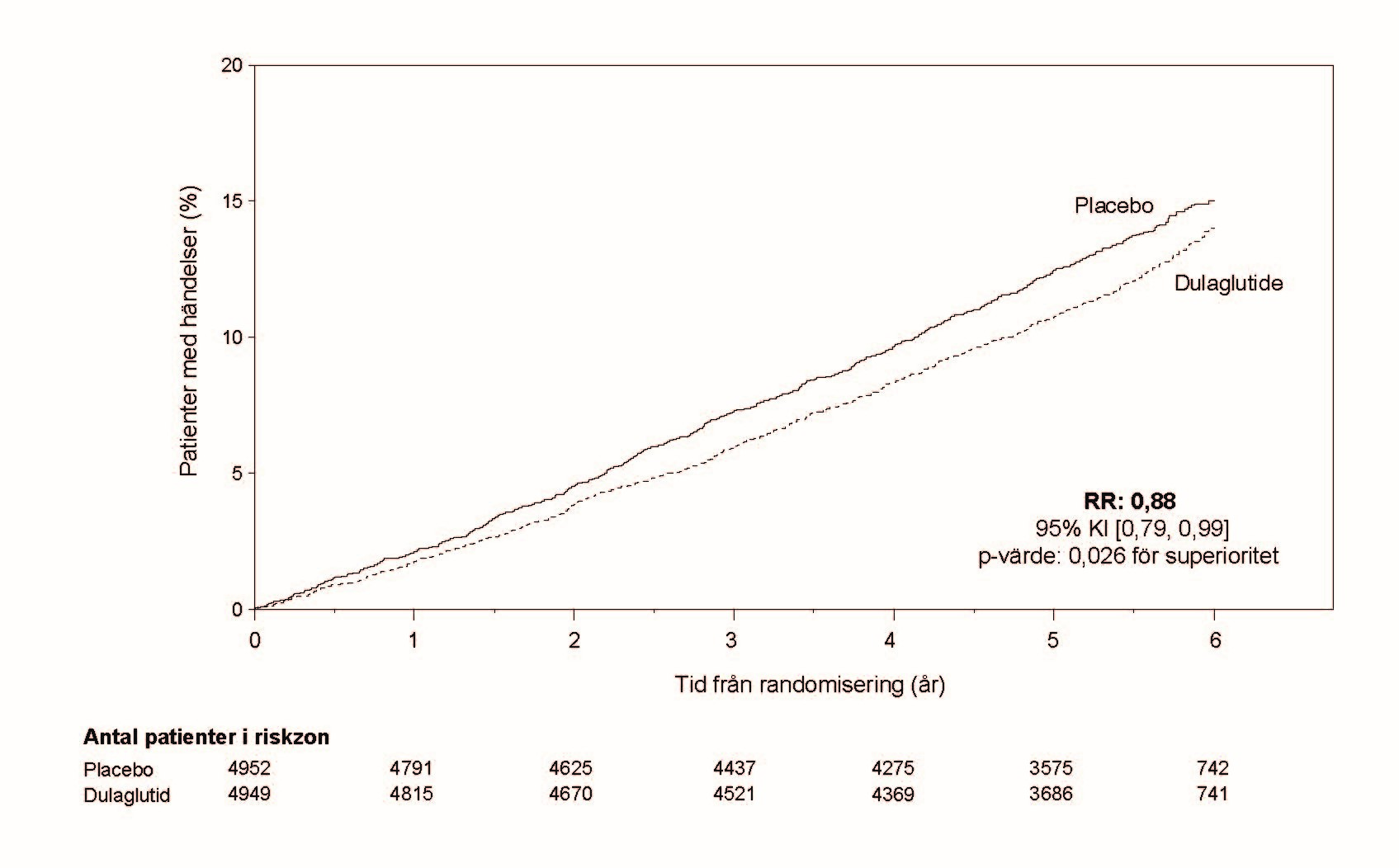 Figur 1. Kaplan-Meier diagram för tid till första förekomst av ett sammansatt utfall: kardiovaskulär död, icke-dödlig hjärtinfarkt eller icke-dödlig stroke, i den långsiktiga dulaglutidstudien för kardiovaskulära utfall.