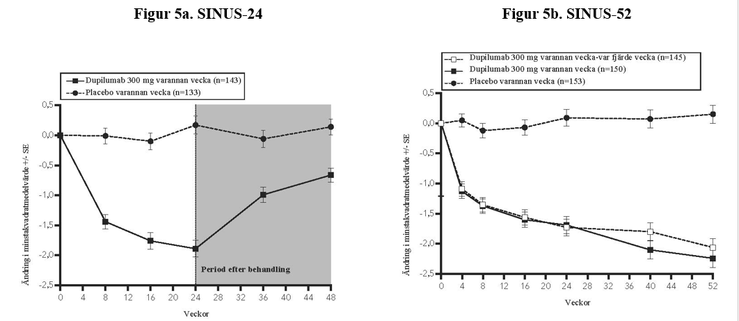 Dupilumabs dalkoncentrationer var lägre hos personer med högre kroppsvikt, men utan relevant påverkan på effekten. Endast 6 patienter som exponerades för dupilumab hade en kroppsvikt på ≥130 kg i de kliniska studierna på patienter med kronisk rinosinuit med näspolyper.
