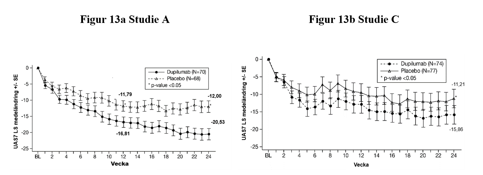 Behandling med dupilumab ledde till en förbättring över tiden i UAS7 under behandlingsperioden på 24 veckor (figur 13).