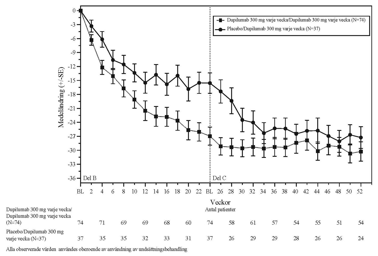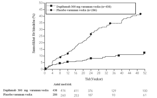 Patienter som får samtidiga orala kortikosteroider kan minska sin steroiddos när klinisk förbättring med dupilumab har inträffat (se avsnitt 5.1). Det rekommenderas att minskningen av steroiddosen sker gradvis (se avsnitt 4.4).