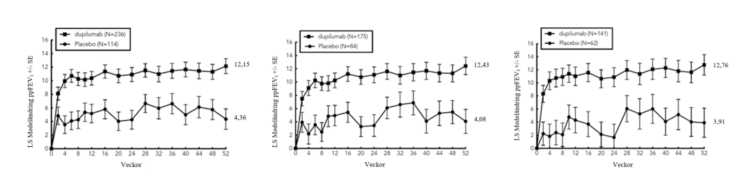 Totalt ingick 107 ungdomar i åldrarna 12 till 17 år med måttlig till svår astma i QUEST-studien och fick antingen 200 mg (N=21) eller 300 mg (N=18) dupilumab (eller motsvarande placebo antingen 200 mg [N=34] eller 300 mg [N=34]) varannan vecka. Effekt med avseende på allvarliga astmaexacerbationer och lungfunktion observerades hos både ungdomar och vuxna. För både doserna 200 mg och 300 mg varannan vecka observerades signifikanta förbättringar i FEV1 (LS-medeländring från baslinjen vid vecka 12) (0,36 l respektive 0,27 l). För dosen 200 mg varannan vecka hade patienterna en minskning av frekvensen av allvarliga exacerbationer som var förenliga med vuxna. Säkerhetsprofilen hos ungdomar var i allmänhet liknande vuxna.