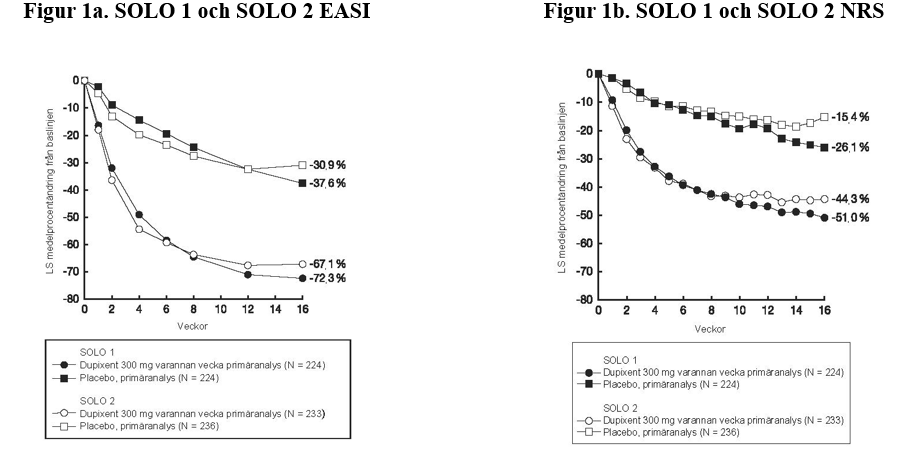 Säkerhet och effekt för dupilumab har fastställts hos pediatriska patienter i åldern 6 månader och äldre med atopisk dermatit. Användning av dupilumab i denna åldersgrupp stöds av studie AD-1526 vilken omfattade 251 ungdomar i åldrarna 12 till 17 år med måttlig till svår atopisk dermatit, i studie AD-1652 vilken omfattade 367 pediatriska patienter i åldrarna 6 till 11 år med svår atopisk dermatit, och studie AD-1539 vilken omfattade 162 barn i åldrarna 6 månader till 5 år med måttlig till svår atopisk dermatit (125 av dessa barn hade svår atopisk dermatit). Långtidsanvändning stöds av studie AD-1434 vilken inkluderade 823 pediatriska patienter i åldrarna 6 månader till 17 år, inklusive 275 ungdomar, 368 barn i åldrarna 6 till 11 år, och 180 barn i åldern 6 månader till 5 år. Säkerhet och effekt var generellt jämförbar mellan barn i åldern 6 månader till 5 år, 6 till 11 år, ungdomar (12 till 17 år) och vuxna med atopisk dermatit (se avsnitt 4.8). Säkerhet och effekt hos pediatriska patienter (< 6 månader) med atopisk dermatit har inte fastställts.