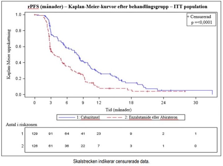 Studien nådde sin primära slutpunkt: rPFS var signifikant längre med cabazitaxel jämfört med AR-riktat läkemedel (8,0 månader respektive 3,7 månader), med en 46 % reduktion av risken för radiografisk progression jämfört med AR-riktat läkemedel (se tabell 6 och figur 2).