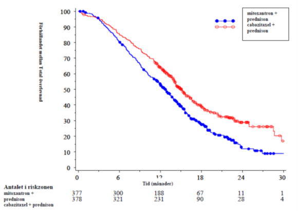 Det fanns en förbättring i PFS i cabazitaxel-armen jämfört med mitoxantron-armen, 2,8 (2,4-3,0) månader jämfört med 1,4 (1,4-1,7), HR (95% CI) 0,74 (0,64-0,86), p <0,0001.