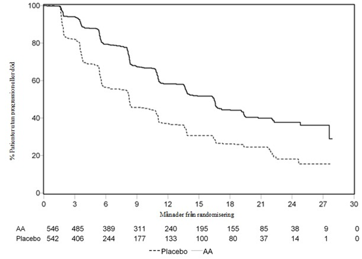 Vid den planerade rPFS‑analysen fanns det 401 händelser, 150 (28 %) av patienterna som behandlades med abirateron och 251 (46 %) av patienterna som behandlades med placebo hade radiografiska tecken på progression eller hade avlidit. En signifikant skillnad i rPFS mellan behandlingsgrupperna observerades (se tabell 6 och figur 3).