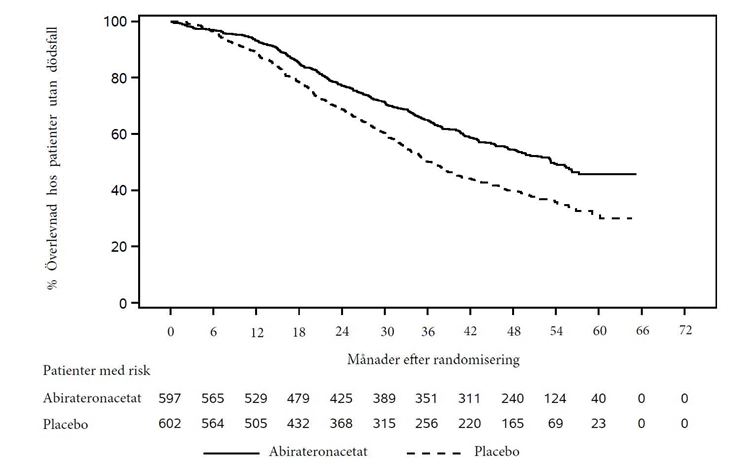 Den planerade slutliga analysen för OS utfördes efter att 741 dödsfall observerats (medianuppföljningstid 49 månader). Sextiofem procent (354 av 546) av patienterna behandlade med abirateron, jämfört med 71 % (387 av 542) av patienterna behandlade med placebo, hade avlidit. En statistiskt signifikant OS‑fördel som talade för den abirateronbehandlade gruppen påvisades med 19,4 % minskning av risken för dödsfall (riskkvot = 0,806; 95 % CI: [0,697; 0,931], p = 0,0033) och en förbättring av median‑OS på 4,4 månader (abirateron 34,7 månader, placebo 30,3 månader) (se tabell 8 och figur 5). Den här förbättringen påvisades trots att 44 % av patienterna i placebogruppen fick abirateron som efterföljande behandling.
